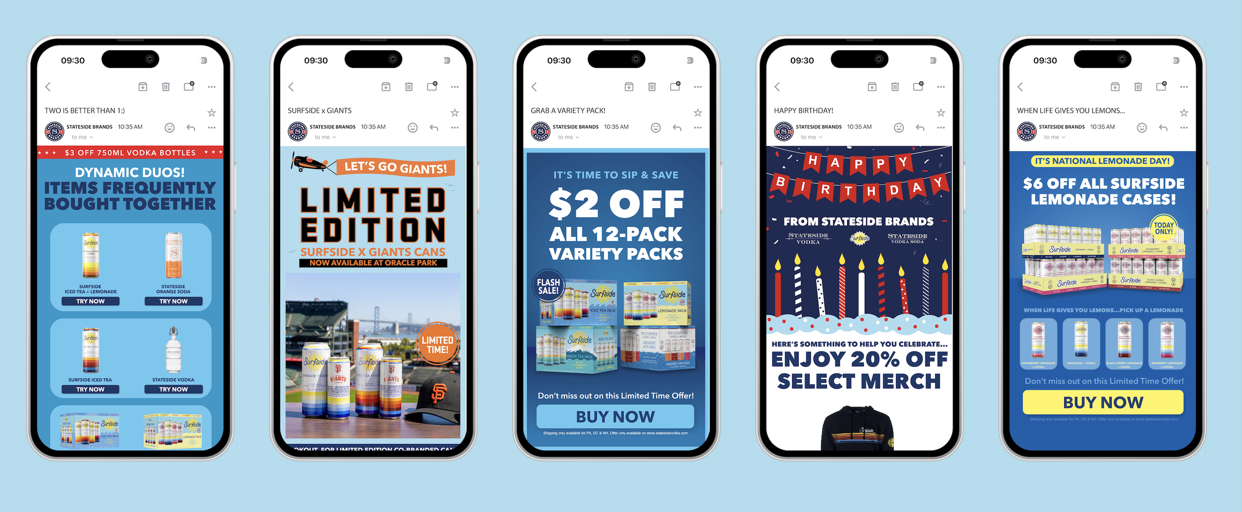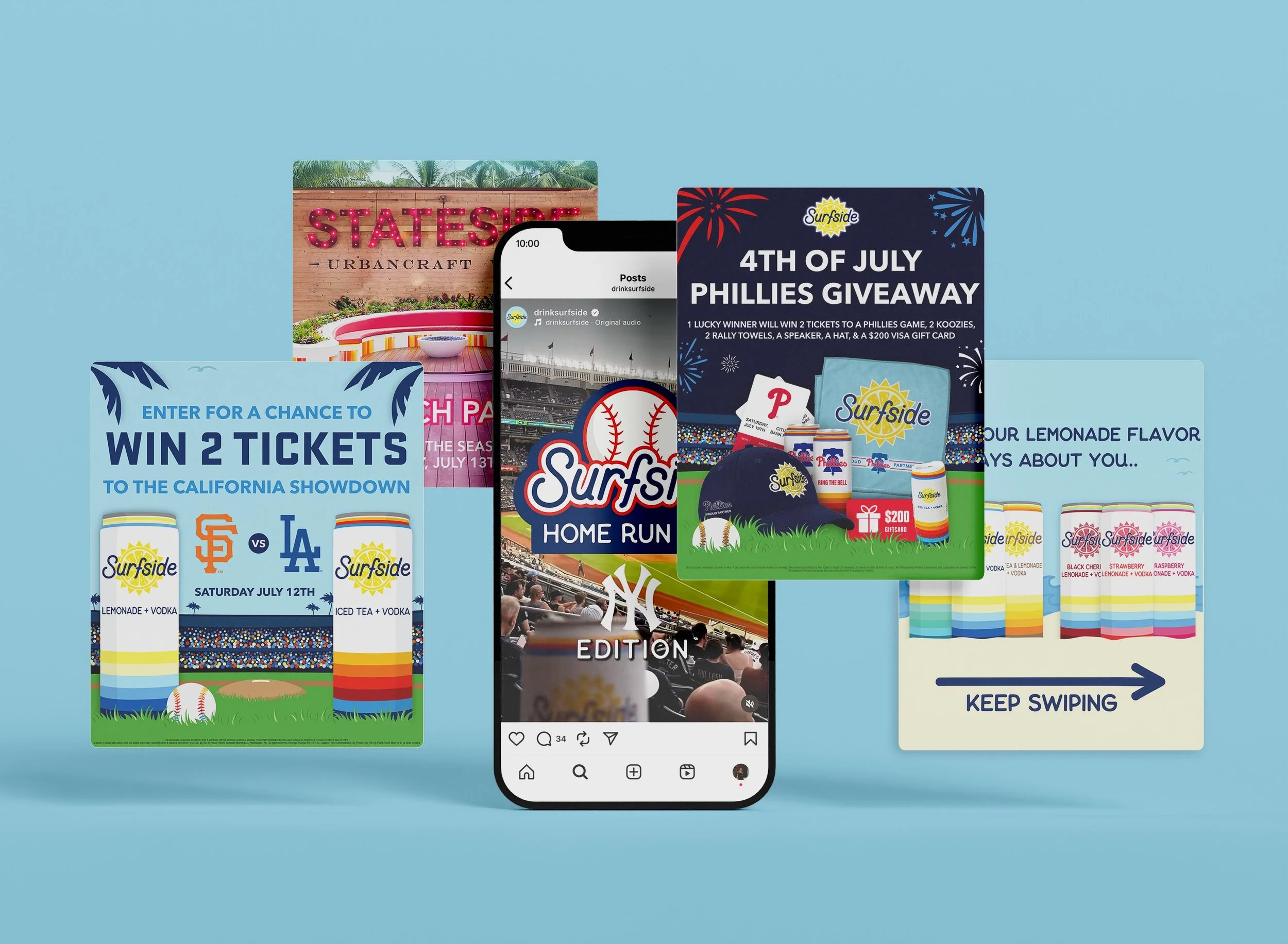 As a graphic design intern at Stateside Brands, home to Surfside, Stateside Vodka, and Stateside Sodas, I contributed to a wide range of design projects that supported the company’s digital marketing efforts. My work focused on creating cohesive visual assets including weekly email layouts, giveaway graphics for MLB team partnerships, story templates, and logo or typography treatments for social content. Each project required adapting to existing brand guidelines while still introducing fresh visual ideas that aligned with Surfside’s energetic and approachable identity.